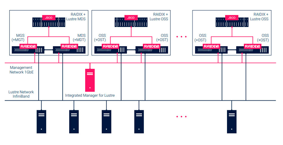 Для обеспечения целостности и сохранности данных Lustre-таргетов применяются программные технологии RAIDIX.